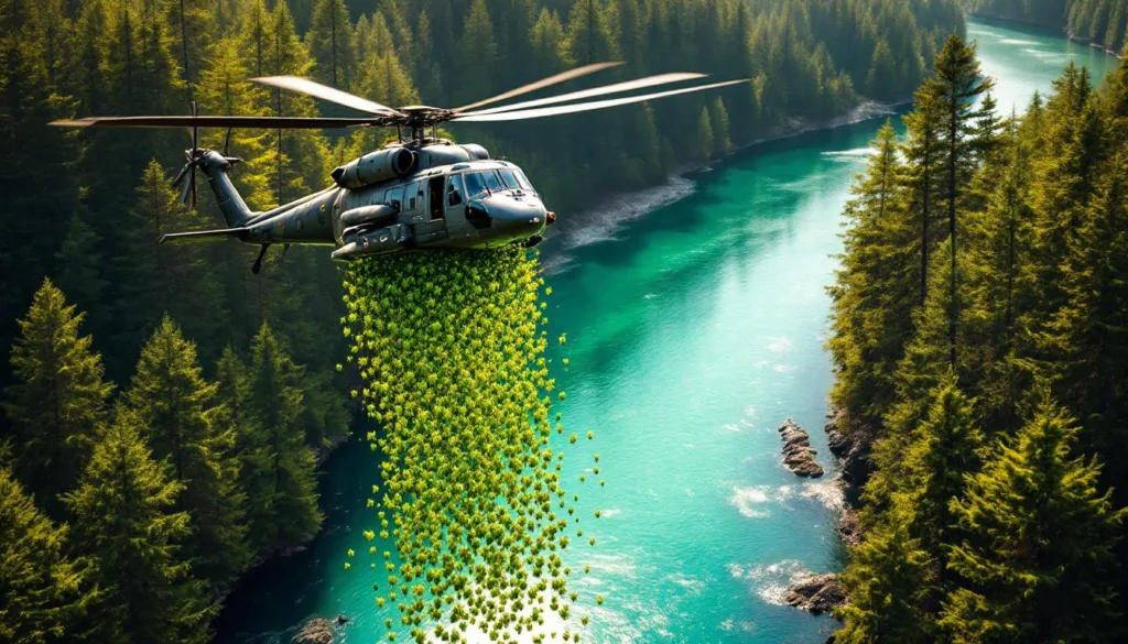 גלה מדוע מסוקים משליכים אלפי גזעים לנהרות באמריקה והשפעתם הסביבתית על האקולוגיה המקומית.